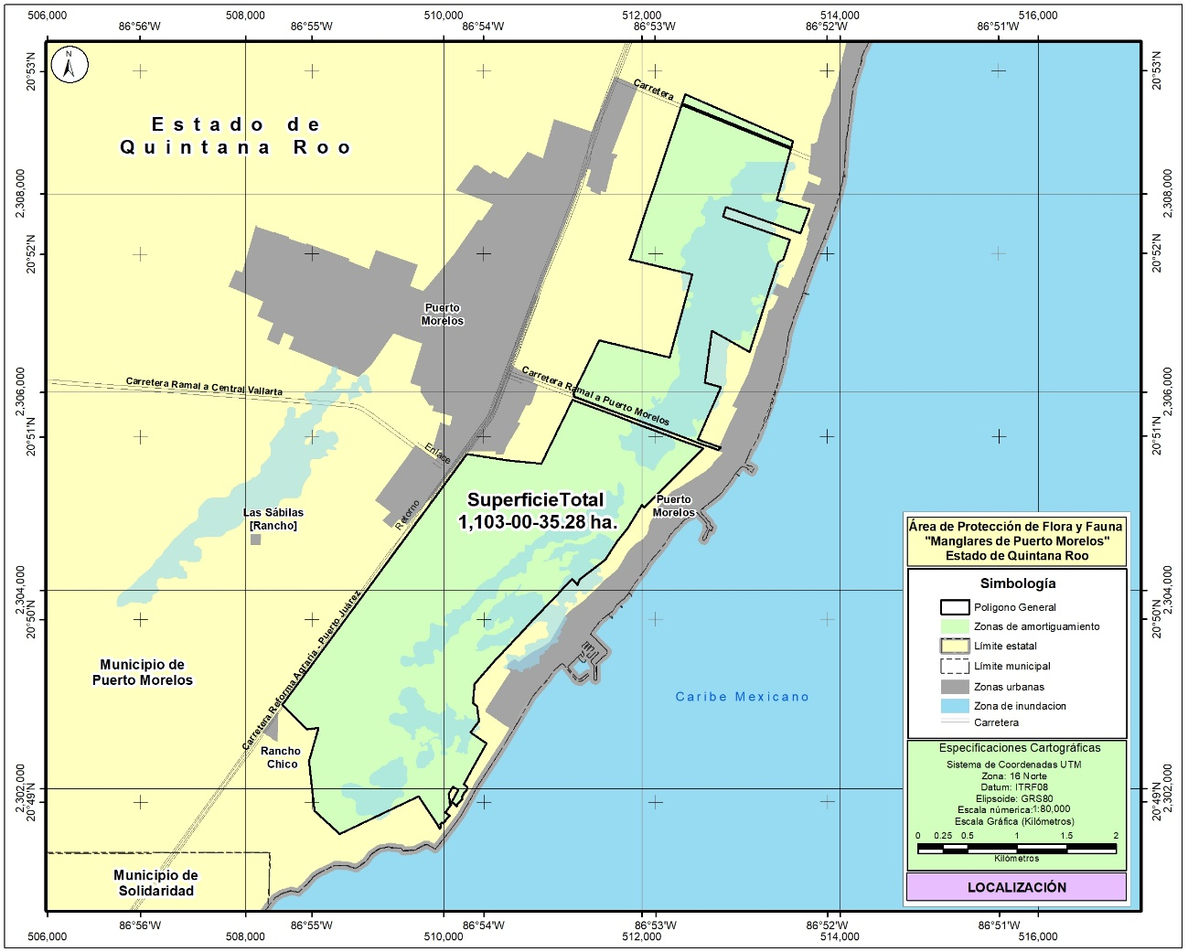 ARTÍCULO PRIMERO. Se declara área natural protegida, con la categoría de área de protección flora y fauna, el sitio Manglares de Puerto Morelos que, de acuerdo con el Marco Geoestadístico, versión 2022 del Instituto Nacional de Estadística y Geografía, se ubica en el municipio de Puerto Morelos, estado de Quintana Roo y que, abarca la superficie de 1,103-00-35.28 hectáreas (un mil ciento tres hectáreas, cero áreas, treinta y cinco punto veintiocho centiáreas), conformada por tres polígonos generales, que corresponden a la zona de amortiguamiento. La descripción limítrofe de los tres polígonos generales que conforman el área de protección de flora y fauna Manglares de Puerto Morelos, se encuentra en un sistema de coordenadas Universal Transversa de Mercator (UTM), zona 16, con Elipsoide GRS80 y Datum Horizontal ITRF08 época 2010.0.