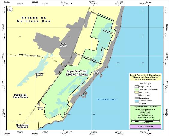 ARTÍCULO PRIMERO. Se declara área natural protegida, con la categoría de área de protección flora y fauna, el sitio Manglares de Puerto Morelos que, de acuerdo con el Marco Geoestadístico, versión 2022 del Instituto Nacional de Estadística y Geografía, se ubica en el municipio de Puerto Morelos, estado de Quintana Roo y que, abarca la superficie de 1,103-00-35.28 hectáreas (un mil ciento tres hectáreas, cero áreas, treinta y cinco punto veintiocho centiáreas), conformada por tres polígonos generales, que corresponden a la zona de amortiguamiento. La descripción limítrofe de los tres polígonos generales que conforman el área de protección de flora y fauna Manglares de Puerto Morelos, se encuentra en un sistema de coordenadas Universal Transversa de Mercator (UTM), zona 16, con Elipsoide GRS80 y Datum Horizontal ITRF08 época 2010.0.