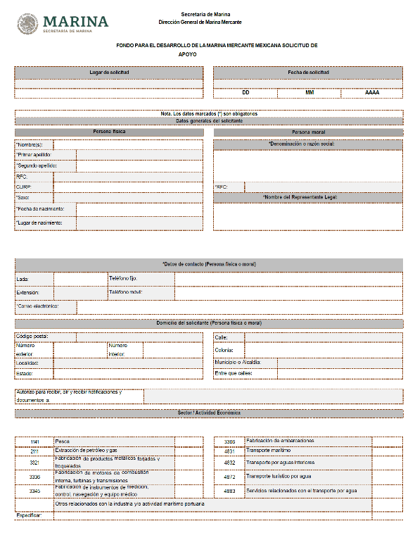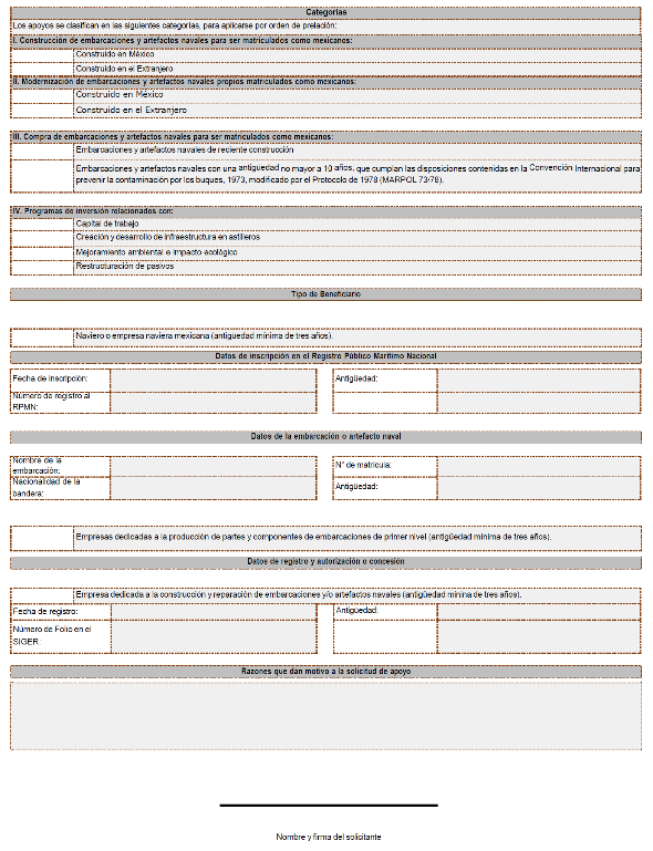 XVI. Solicitud de Apoyo: Documento señalado en el Anexo I de las presentes Reglas de Operación, el cual presenta el Sujeto de Apoyo ante la Dirección General de Marina Mercante.