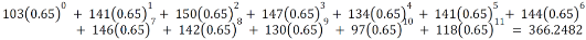A.1.3 Se multiplica cada concentración horaria por el factor de ponderación elevado a una potencia igual a las horas que han pasado desde la medición de ese dato. Se suman los productos: