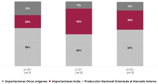 204. La Secretaría tampoco tuvo elementos que indicaran que las importaciones de otros orígenes pudieran ser causa de un potencial daño a la rama de producción nacional, ya que registraron un descenso de 12% durante el periodo analizado de punta a punta (al tener una caída de 33% en el periodo julio de 2021-junio de 2022, respecto al periodo anterior comparable, y un incremento de 30% en el periodo investigado). Asimismo, no se cuenta aún con los elementos suficientes para establecer, en su caso, la afectación a la rama de producción nacional, puesto que, aun cuando aumentaron su participación en el CNA en 3 puntos porcentuales en el periodo investigado, esta disminuyó en el periodo analizado en 7 puntos porcentuales al pasar del 21% en el periodo julio de 2020-junio de 2021 al 14% en el periodo investigado (mientras que, en relación con el Consumo Interno, tuvieron un comportamiento similar).