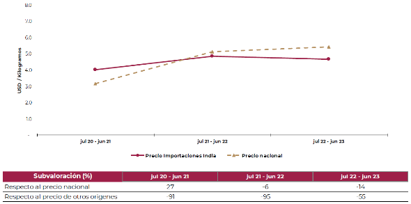 141. Con la finalidad de evaluar la existencia de subvaloración, la Secretaría comparó el precio de las ventas al mercado interno de la rama de producción nacional con los precios de las importaciones del producto objeto de investigación; para ello, los ajustó añadiendo el arancel correspondiente, así como los gastos de agente aduanal y derechos de trámite aduanero. 142. En el periodo julio de 2020-junio de 2021, la Secretaría observó que el precio promedio de las importaciones del producto objeto de investigación se ubicó por arriba del precio de venta al mercado interno de la rama de producción nacional en 27%, pero fue menor en 6% y 14% en los periodos julio de 2021-junio de 2022 y en el periodo investigado, respectivamente. Considerando el comportamiento de estos precios, se observa que el diferencial entre ellos se explica principalmente por el incremento observado en el precio de venta al mercado interno de la rama de producción nacional. Asimismo, cabe destacar que en el periodo investigado las importaciones investigadas disminuyen, lo cual coincide con el periodo en el que la subvaloración es mayor. 143. En relación con el precio promedio de las importaciones de otros orígenes, en los periodos julio de 2020-junio de 2021, julio de 2021-junio de 2022 y julio de 2022-junio de 2023, el precio de la metformina objeto de investigación fue menor en porcentajes del 91%, 95% y 55%, respectivamente. Estos resultados se ilustran en la siguiente gráfica: Precios de las importaciones y del producto nacional
