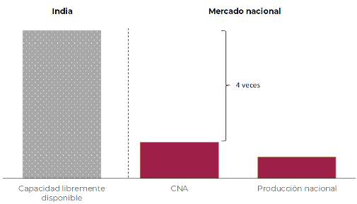 g. La información disponible indica que la India cuenta con una capacidad libremente disponible significativamente mayor en relación con la producción nacional y el tamaño del mercado mexicano del producto similar, lo que permite presumir que podría continuar orientando parte de sus exportaciones al mercado nacional.