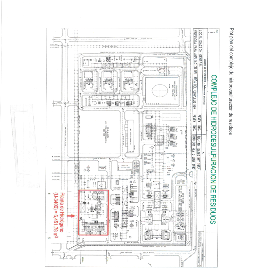 Que la Planta de Hidrógeno U-3400 se encuentra ubicada en una fracción de terreno de 6,451.78 m² dentro de una serie de plantas denominado "Complejo de hidrodesulfuración de residuos" al interior de la Refinería Miguel Hidalgo, en Tula de Allende Hidalgo, conforme a los siguientes planos: