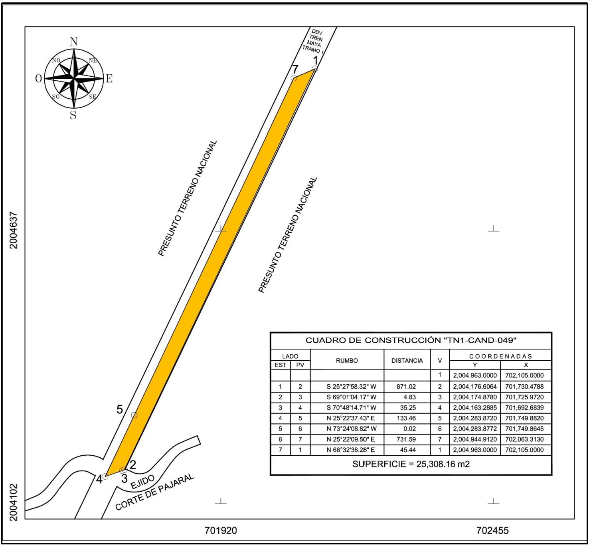 Esta última, mediante oficio No.II210.DGOPR.DTN.00900.2024 del 15 de enero de 2024, autorizó los trabajos de medición y deslinde del predio presuntamente propiedad de la nación denominado "TN1-CAND-049" o también llamado "TN1-CAND-049 (SUP. 010)", con una superficie aproximada de 25,308.16 metros cuadrados, ubicado en el municipio de Candelaria, estado de Campeche. Asimismo, en el oficio de referencia se comisionó al suscrito perito deslindador para llevar a cabo la medición y deslinde del citado predio, por lo que, en cumplimiento a los artículos 14 Constitucional, 3 de la Ley Federal de Procedimiento Administrativo, 160 de la Ley Agraria, 101, 104 y 105 Fracción I del Reglamento de la Ley Agraria en Materia de Ordenamiento de la Propiedad Rural, se publica, por una sola vez en el Diario Oficial de la Federación, en el Periódico Oficial del Gobierno del estado de Campeche y en el periódico de mayor circulación de esa entidad federativa con efectos de notificación a los propietarios, poseedores, colindantes y todo aquel que considere que los trabajos de deslinde lo pudiesen afectar, para que dentro del plazo de 30 días hábiles contados a partir de la publicación del presente Aviso en el Diario Oficial de la Federación, comparezcan para exponer lo que a su derecho convenga, así como para presentar la documentación que fundamente su dicho en copia certificada o en copia simple acompañada del documento original para su cotejo, en términos de la fracción II del artículo 15-A de la Ley Federal de Procedimiento Administrativo. Así mismo, en su comparecencia deberán señalar domicilio cierto para oír y recibir notificaciones. El croquis se encontrará a la vista de cualquier interesado correspondiente en la oficina de representación ubicada en Avenida 16 de Septiembre S/N, Palacio Federal, 2° Piso, Colonia Centro, San Francisco de Campeche, Campeche, C.P. 24000, México. Se hace saber que dicho aviso con el croquis respectivo se fijará a su vez, en los parajes cercanos al predio.