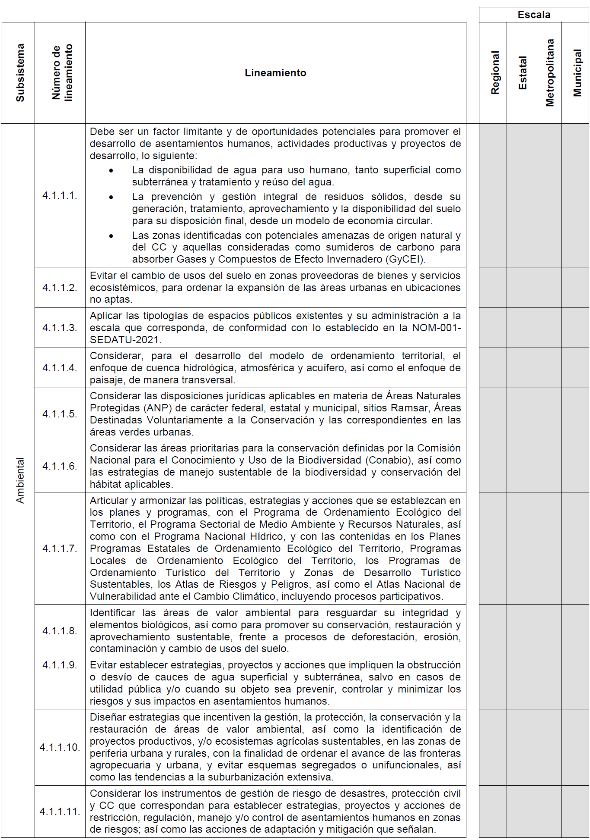 La Norma Oficial Mexicana (NOM), es un instrumento regulatorio innovador que, a partir de diez principios transversales adaptados a las realidades ambientales, sociales, culturales, políticas y económicas, establece una serie de lineamientos enmarcados en los subsistemas que conforman el sistema territorial, los cuales deben ser considerados en los procesos de elaboración o actualización de los planes y programas de ordenamiento territorial y desarrollo urbano.