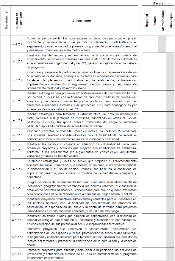 La presente NOM tiene un alcance nacional, su implementación será acorde a lo señalado en el apartado 5, correspondiente al PEC y su aplicación es en los procesos de elaboración o actualización de los planes y programas de ordenamiento territorial y desarrollo urbano a los que se refieren las fracciones II, III, IV y V del artículo 23 de la Ley General de Asentamientos Humanos, Ordenamiento Territorial y Desarrollo Urbano (LGAHOTDU): Programas estatales de ordenamiento territorial y Desarrollo Urbano, programas de zonas metropolitanas o conurbaciones, los planes o programas municipales de Desarrollo Urbano, y sus derivados, tales como los de Centros de Población, parciales, sectoriales, esquemas de planeación simplificada y de centros de servicios rurales. Así como, de los Programas Regionales de Ordenamiento Territorial, que señala la Estrategia Nacional de Ordenamiento Territorial (ENOT).