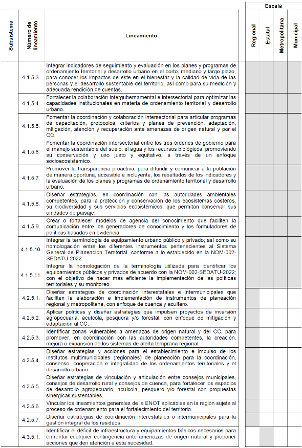 En virtud de lo anterior, se tiene a bien expedir la presente: NORMA OFICIAL MEXICANA NOM-003-SEDATU-2023, QUE ESTABLECE LOS LINEAMIENTOS PARA EL FORTALECIMIENTO DEL SISTEMA TERRITORIAL PARA RESISTIR, ADAPTARSE, RECUPERARSE ANTE AMENAZAS DE ORIGEN NATURAL Y DEL CAMBIO CLIMÁTICO A TRAVÉS DEL ORDENAMIENTO TERRITORIAL.