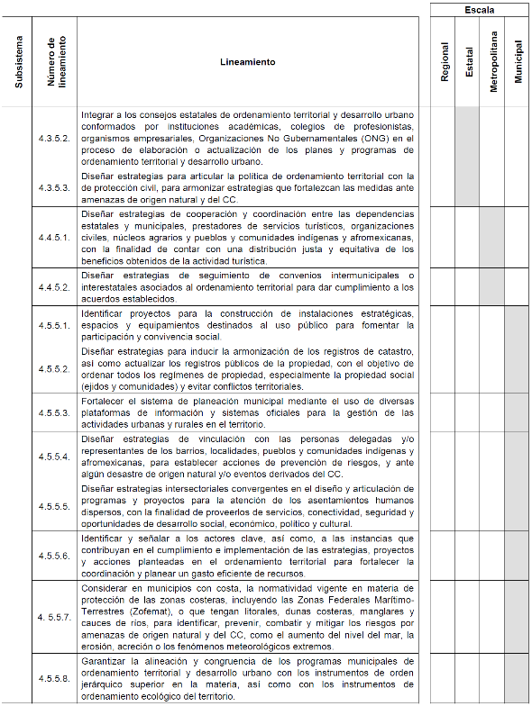 4.5.5.7. Considerar en municipios con costa, la normatividad vigente en materia de protección de las zonas costeras, incluyendo las Zonas Federales Marítimo-Terrestres (Zofemat), o que tengan litorales, dunas costeras, manglares y cauces de ríos, para identificar, prevenir, combatir y mitigar los riesgos por amenazas de origen natural y del CC, como el aumento del nivel del mar, la erosión, acreción o los fenómenos
