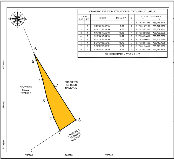 En atención a las Obras del Gobierno de México consideradas de interés público y seguridad nacional, así como los proyectos prioritarios y estratégicos para el desarrollo nacional, con la finalidad de procurar por el óptimo aprovechamiento de los bienes del dominio público de la federación y atendiendo al Plan Nacional de Desarrollo 2019-2024, en el caso específico del Proyecto Prioritario denominado Tren Maya, FONATUR Tren Maya, S.A. de C.V., realiza una solicitud sobre el polígono denominado "SUPERFICIE SIN IDENTIFICAR 7, también denominado 002_EMUC_AF_7" con fundamento en lo dispuesto por los artículos 27 de la Constitución Política de los Estados Unidos Mexicanos; 41 de la Ley Orgánica de la Administración Pública Federal; 1, 2, 12, 13, 19, y 50 de la Ley Federal de Procedimiento Administrativo; 2, 6 fracción VII, 28, 49, 59 al 61, 66 y 84 de la Ley General de Bienes Nacionales; 2, 158, 159, 161 y demás aplicables de la Ley Agraria; 112 del Reglamento de la Ley Agraria en materia de Ordenamiento de la Propiedad Rural y 20 fracciones V y XII del Reglamento Interior de la Secretaría de Desarrollo Agrario, Territorial y Urbano, se faculta a la Secretaría de Desarrollo Agrario, Territorial y Urbano, a través de la Subsecretaría de Ordenamiento Territorial y Agrario y, la Dirección General de Ordenamiento de la Propiedad Rural, para la administración de los terrenos baldíos y nacionales.