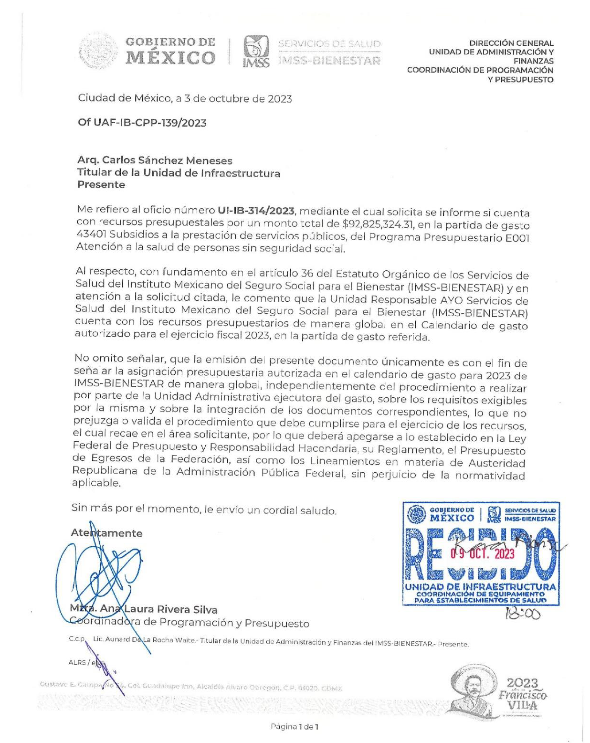 9. Mediante oficio número UI-IB-314/2023 de fecha 03 de octubre del 2023, el Titular de la Unidad de Infraestructura del "IMSS-BIENESTAR", solicitó a la Unidad de Administración y Finanzas del "IMSS-BIENESTAR", que con cargo a los recursos presupuestarios federales con el carácter de subsidios, se hicieran las gestiones para apoyar con recursos financieros al Estado de Baja California para los fines señalados, recursos Presupuestarios Federales con el carácter de Subsidios para apoyar la adquisición de equipamiento para establecimientos de salud, con cargo a los recursos del programa presupuestario E001, "Atención a la Salud de Personas sin Seguridad Social" para el Ejercicio Fiscal 2023".