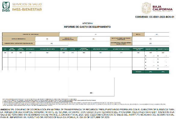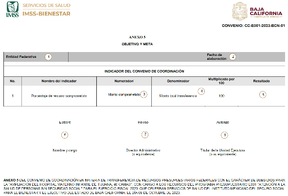 FIRMAS DE LOS ANEXOS 1, 2, 3, 4, 5, 6 y 7 DEL CONVENIO DE COORDINACIÓN EN MATERIA DE TRANSFERENCIA DE RECURSOS PRESUPUESTARIOS FEDERALES CON EL CARÁCTER DE SUBSIDIOS PARA LA "AMPLIACIÓN DEL HOSPITAL MATERNO INFANTIL DE TIJUANA, 40 CAMAS", CON CARGO A LOS RECURSOS DEL PROGRAMA PRESUPUESTARIO E001 "ATENCIÓN A LA SALUD DE PERSONAS SIN SEGURIDAD SOCIAL" PARA EL EJERCICIO FISCAL 2023, QUE CELEBRAN SERVICIOS DE SALUD DEL INSTITUTO MEXICANO DEL SEGURO SOCIAL PARA EL BIENESTAR Y EL EJECUTIVO DEL ESTADO DE BAJA CALIFORNIA, EL DÍA 09 DE OCTUBRE DE 2023.