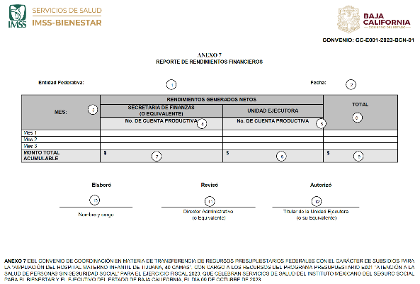 "EL GOBIERNO DE LA ENTIDAD" presentará al cierre del ejercicio fiscal, un reporte de los rendimientos financieros que generen los recursos presupuestarios federales transferidos en virtud del presente instrumento jurídico, desglosado por mes, conforme al Anexo 7 de este Convenio de Coordinación.
