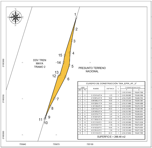 En atención a las Obras del Gobierno de México consideradas de interés público y seguridad nacional, así como los proyectos prioritarios y estratégicos para el desarrollo nacional, con la finalidad de procurar por el óptimo aprovechamiento de los bienes del dominio público de la federación y atendiendo al Plan Nacional de Desarrollo 2019-2024, en el caso específico del Proyecto Prioritario denominado Tren Maya, FONATUR Tren Maya, S.A. de C.V., realiza una solicitud sobre el polígono denominado "S. ADICIONAL 3 también denominado 004_EPIX_AF_3" con fundamento en lo dispuesto por los artículos 27 de la Constitución Política de los Estados Unidos Mexicanos; 41 de la Ley Orgánica de la Administración Pública Federal; 1, 2, 12, 13, 19, y 50 de la Ley Federal de Procedimiento Administrativo; 2, 6 fracción VII, 28, 49, 59 al 61, 66 y 84 de la Ley General de Bienes Nacionales; 2, 158, 159, 161 y demás aplicables de la Ley Agraria; 112 del Reglamento de la Ley Agraria en materia de Ordenamiento de la Propiedad Rural y 20 fracciones V y XII del Reglamento Interior de la Secretaría de Desarrollo Agrario, Territorial y Urbano, se faculta a la Secretaría de Desarrollo Agrario, Territorial y Urbano, a través de la Subsecretaría de Ordenamiento Territorial y Agrario y, la Dirección General de Ordenamiento de la Propiedad Rural, para la administración de los terrenos baldíos y nacionales.