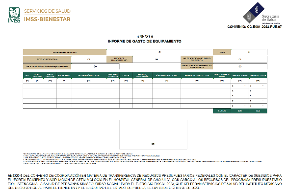 | 6 | Campímetro computarizado 1. Equipo computarizado fijo, empleado para la determinación del campo visual y escotómas, utilizado con fines de diagnóstico y tratamiento. 2. Campímetro con moderna tecnología para la determinación de escotómas y estudios del campo visual. 3. Con monitor de tubo de rayo catódico integrado, con pantalla sensible al tacto y teclado alfanumérico. 4. Computadora con microprocesador integrado. 5. Disco duro con 500 GB, puerto para USB. 6. Hemiesfera de 30 cm de diámetro para distancia de exámenes a 30 cms. 7. Intensidad lumínica de la esfera de 31.5 ASB. 8. Duración del estímulo de 200 ms. 8. Longitud de onda de todo el espectro visible para: 8.1 Pruebas cinéticas con estímulo Goldman I-V. 8.2 Para temprano reconocimiento de glaucoma. 8.3 Medición automática de las pupilas 9. Mentonera y cabezal de apoyo son automáticos y permanentemente controlados en su posición durante todo el examen. 10. Accesorios: 10.1 Impresora tipo láser. 10.2 Mesa de elevación electromotorizada. Con soporte especial para desplazamiento del equipo en el eje con acceso para pacientes en silla de ruedas. | EQUIPO MÉDICO | 1 | $856,187.80 | $856,187.80 | 7 | Carro rojo con equipo completo para reanimación con desfibrilador-monitor-marcapaso 1. Carro rojo de plástico con desfibrilador de onda bifásica con marcapasos y monitoreo multiparamétrico. 2. Carro de emergencia. 2.1. de material plástico o polímero de alto impacto. 2.2. dimensiones: longitud entre 70 cm. y 80 cm. ancho entre 55 cm. y 65 cm. altura entre 90cm. y 100 cm. 2.3. con manubrio para su conducción. 2.4. cuatro ruedas dobles antiestáticas, giratorias, de calidad hospitalaria, de 12.5 cm. de diámetro como mínimo. 2.5. con sistema de frenado en al menos dos ruedas. 2.6. superficie para colocar el desfibrilador- monitor: 2.6.1. con capacidad de giro. 2.6.2. con mecanismo para fijar la posición. 2.6.3. con dispositivo para sujeción del desfibrilador. 2.6.4. superficie para la preparación de soluciones. 2.6.5. con cuatro cajones como mínimo: 2.6.5.1. un cajón con divisores de material resistente y desmontables para la clasificación y separación, cuatro divisiones como mínimo. 2.6.6. sistema de seguridad. 2.6.6.1. cerradura general para todos los compartimentos, con sistema de sellos de garantía. 2.6.7. con poste portavenoclísis ajustable e integrado. 2.6.8. tabla para masaje cardíaco, con longitud de 45 x 60 cm como mínimo de material ligero, resistente al impacto, inastillable y lavable, montada al carro. 2.6.9. esquinas del carro redondeadas o bordes lisos. 2.6.10. con sistema de sujeción para tanque de oxígeno tipo e. 3. Reanimador pulmonar manual (reusable). 3.1. desarmable y esterilizable en vapor. 3.2. bolsa de silicona transparente o semitransparente. 3.3. autoinflable. 3.4. tamaño adulto (una pieza). 3.4.1. volumen de la bolsa de 1500 ml como mínimo 3.5. tamaño pediátrico (una pieza). 3.5.1. volumen de la bolsa en el rango de 500 a 600 ml. 3.6. tamaño neonatal (una pieza). 3.6.1. volumen de la bolsa de 320 ml como máximo. 3.7. mascarillas de la misma marca 3.7.1. tamaño adulto, pediátrico y neonatal, esterilizables en vapor. 3.7.2. rotación de 360° entre la mascarilla y la válvula hacia el paciente. 3.8. válvula de no reinhalación de baja resistencia espiratoria. 3.9. conexión para oxígeno suplementario. 4. Equipo de intubación orotraqueal: 4.1. mango: 4.1.1. hecho de metal y que no cause corrosión. 4.1.2. acabado acanalado o rugoso. 4.1.3. compatibles con todos los modelos de hojas 4.2. batería recargable a la corriente de forma directa. 4.3. iluminación led a través de fibra óptica de 3.5 volts como mínimo. 4.4. hojas de laringoscopio 4.4.1. de acero inoxidable. 4.4.2. rectas (miller) de la misma marca que el mango, juego de 6 piezas de los números 00, 0,1, 2, 3 y 4 4.4.3. curvas, de la misma marca que el mango, juego de 4 piezas de los números 1, 2, 3 y 4. 4.5. estuche para guarda de mangos y hojas. 5. Un tanque de oxígeno tipo "e" con manómetro y válvula reguladora y frasco humidificador. 6. Desfibrilador. 6.1. para desfibrilación manual y modo semiautomático (modo dea), cardioversión y monitoreo continúo integrado. 6.2. con selector de nivel de energía para descarga bifásica seleccionable a 1, 2, 3, 4, 5, 6, 7, 8, 9, 10, 15, 20, 30, 50, 70, 100,120,150, 170 y 200 julios como máximo. 6.3. capacidad de autodescarga cuando no se utilice en un plazo máximo de 30, 60 o 90 segundos. 6.4. con sistema para probar energía de descarga. 6.5. tiempo de carga de 6 segundos o menor para máxima energía. 6.6. con selector de modo: cardioversión, desfibrilación, marcapasos y modo semiautomático (modo dea). 6.7. con capacidad de desfibrilación interna (cirugía de corazón abierto) y externa. 6.8. cable para uso de electrodos de desfibrilación y/o marcapasos. 7. Marcapaso transcutáneo. 7.1. interconstruido usando electrodos autoadheribles 7.2. amplitud del pulso seleccionable en un rango de 10 ma o menor a 200 ma o mayor. 7.3. duración de pulso de 20 milisegundos o menor 7.4. frecuencia de marcapasos ajustable en el rango de 30 pulsos por minuto o menor a 180 pulsos por minuto o mayor. 7.5. activación por modos: fijo (o asincrónico) y a demanda (o sincrónico). 7.6. despliegue de parámetros en pantalla. 8. Monitor. 8.1. pantalla lcd a color o tecnología superior de 17.8 cm (7 pulgadas) como mínimo. 8.2. ecg 8.2.1. un cable troncal y cable de paciente para ecg de cinco puntas 8.2.2. alarmas audibles y visibles de la frecuencia cardiaca. 8.2.3. análisis e interpretación de alteraciones del trazo de ecg (arritmias). 8.3. con despliegue numérico y de onda de los siguientes parámetros: frecuencia cardiaca, despliegue de un trazo de ecg como mínimo a seleccionar entre 7 derivaciones: (di, dii, diii, avr, avl, avf y v). 8.4. presión no invasiva: 8.4.1. modos para la toma de presión: manual y automática a diferentes intervalos de tiempo 8.