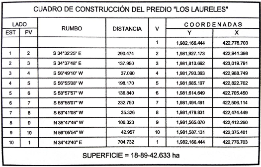 PRIMERO. Se declara Terreno Nacional el predio denominado Los Laureles con una superficie analítica, delimitada de 18-89-42.633 has. (Dieciocho hectáreas, ochenta y nueve áreas, cuarenta y dos centiáreas, seiscientas treinta y tres milésimas de centiárea), ubicado en el municipio de Huimanguillo, estado de Tabasco, cuyas coordenadas y colindancias están descritas en el resultando número 7 de esta resolución.
