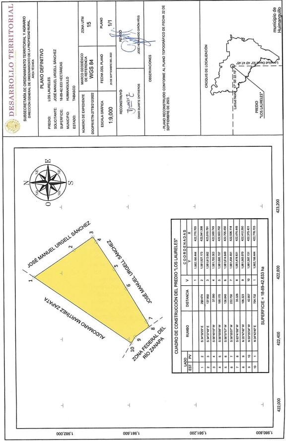 1. Con escrito del 03 de marzo de 2022, suscrito por José Manuel Urgell Sánchez, se inició procedimiento de enajenación onerosa de Terreno Nacional, respecto del predio denominado Los Laureles, con una superficie aproximada de 19-11-07.38 (diecinueve hectáreas, once áreas, siete centiáreas, treinta y ocho centésimas de centiárea), ubicado en el municipio de Huimanguillo, estado de Tabasco, al cual se le asignó número de expediente DGOPR/IETN-27TB/212/2022.