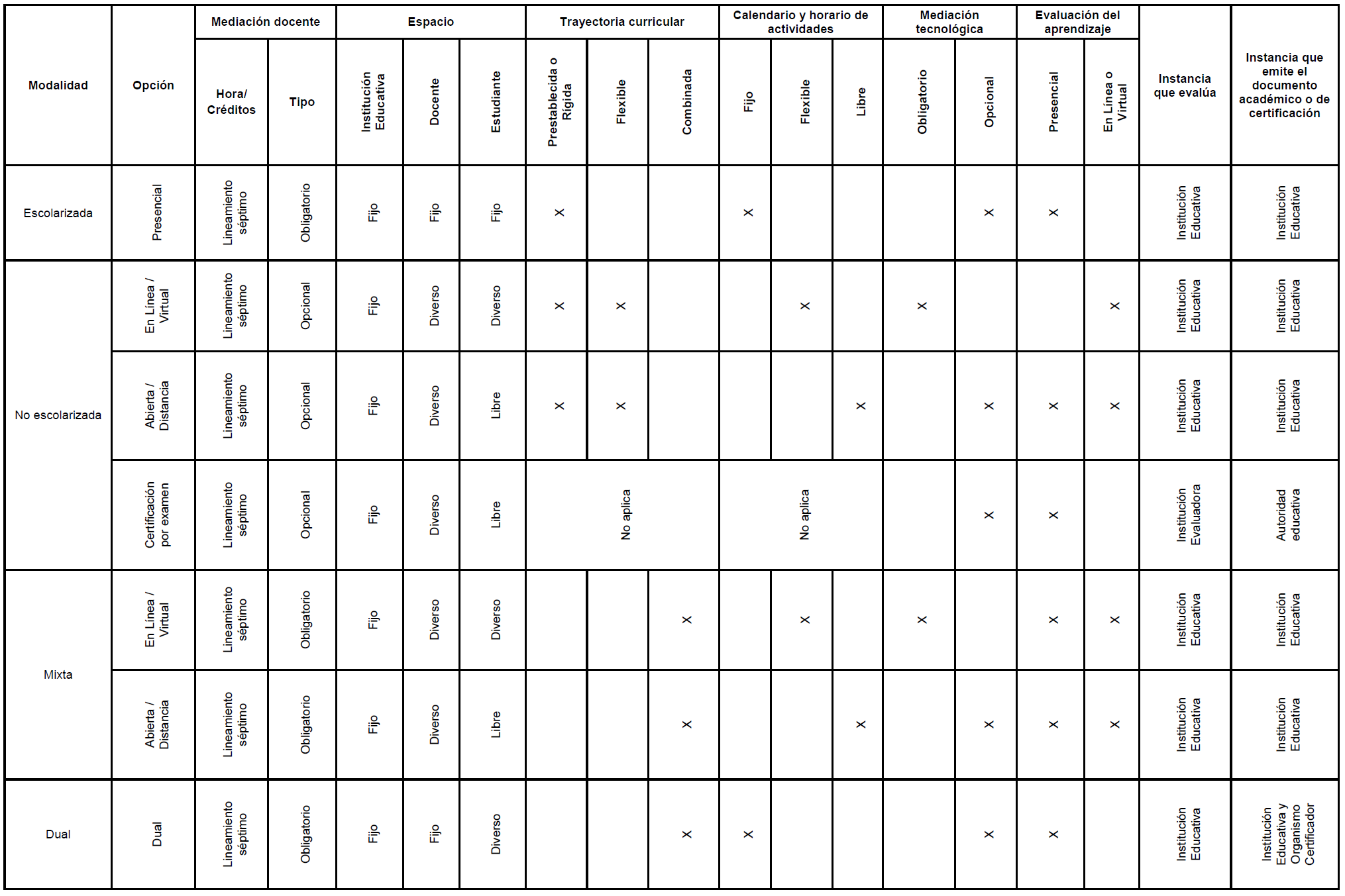 | Niveles del tipo superior | Créditos mínimos por nivel | Horas mínimas (bajo conducción docente e independientes) por nivel | Modalidad escolarizada | Modalidad no escolarizada | Modalidad Mixta y Modalidad Dual |