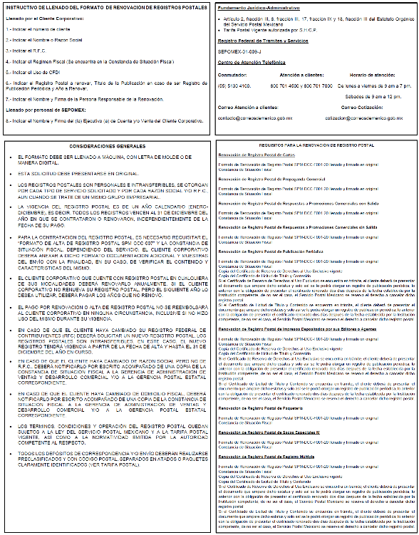 | SEPOMEX-01-009-J | Solicitud de Autorización de Renovación de Registro Postal en sus diferentes Servicios para Depósitos Masivos de Clientes Corporativos. (Cartas, Impresos Depositados por sus Editores o Agentes y Publicaciones Periódicas). | Formato de Renovación de Registros Postales SPM-DCC-F001-20 |