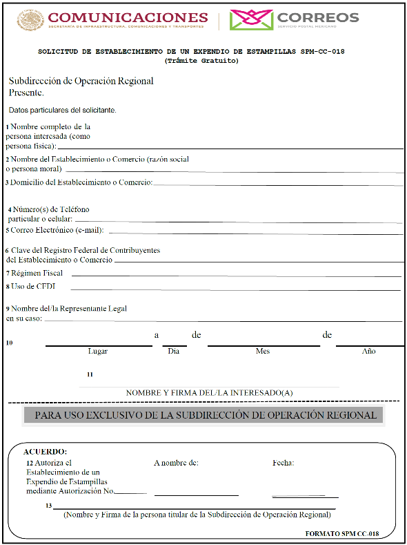 | SEPOMEX-00-006-A | Solicitud de Establecimiento de un Expendio de Estampillas. (Persona Física). | Solicitud de Establecimiento de un Expendio de Estampillas SPM-CC-018 |