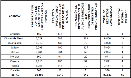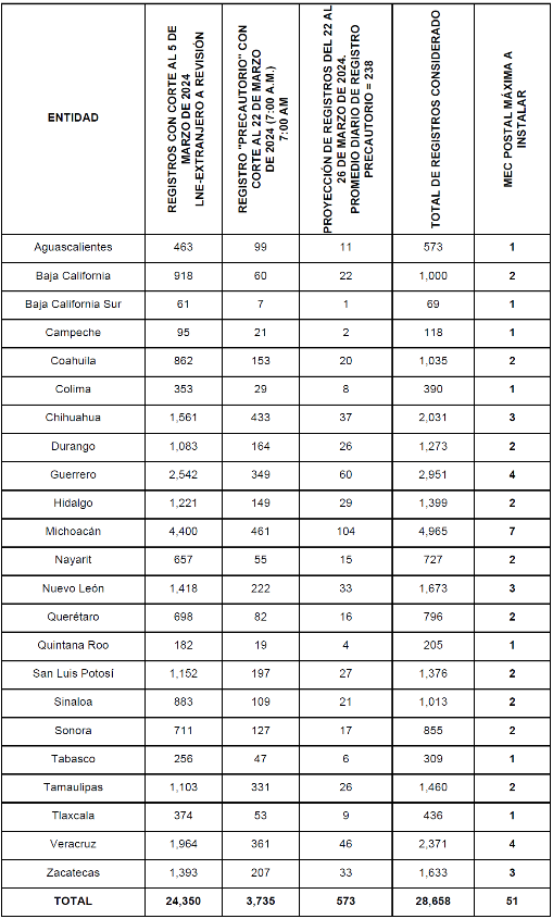 El número final de MEC Postales y MEC Postales Únicas a integrar e instalar se realizará, se calculará con base en el número de registros en la LNE-Extranjero, con corte al 2 de abril de 2024.
