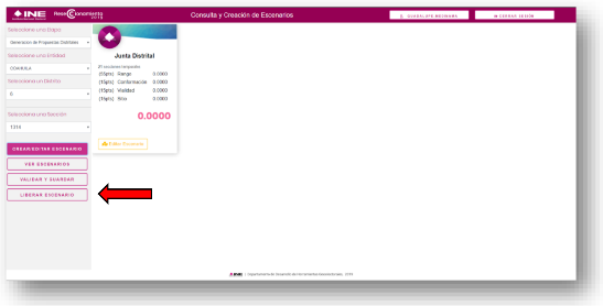 Posteriormente, y considerando que el escenario de reseccionamiento que se empleará como base para los trabajos en el ámbito local, siempre será el que obtenga la mayor calificación, por lo que la o el Presidente de la CDV en el pleno de la sesión, liberará este escenario presionando el botón "liberar" en la pantalla principal del sistema de reseccionamiento, como se muestra en la imagen siguiente: