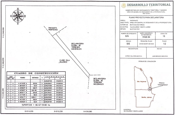 AVISO DE MEDICIÓN Y DESLINDE DEL PREDIO INNOMINADO, CON UNA SUPERFICIE APROXIMADA DE 86-67-54.82 HECTÁREAS, UBICADOS EN LOS MUNICIPIOS DE ISLA MUJERES Y BENITO JUÁREZ, EN EL ESTADO DE QUINTANA ROO.