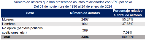 Ahora bien, el número de mujeres que se han constituido como actoras en asuntos relacionados con violencia política en razón de género asciende a 2407, lo que representan el 55.24% del total de actores.
