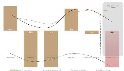 d. Las disminuciones en 2023 se observarían principalmente en los siguientes indicadores: producción (11%); producción orientada al mercado interno (13%); volumen de ventas al mercado interno (12%); valor de ventas al mercado interno medido en dólares (23%); empleo (10%); productividad (1%); utilización de la capacidad instalada (5 puntos porcentuales); aumento de inventarios (19%), y pérdida de participación en el mercado (6 puntos porcentuales). Por lo que se refiere a los indicadores financieros, los ingresos por ventas en el mercado interno serían 24% menores, mientras que los costos de operación solo serían 2% menores, por lo que el comportamiento combinado de ambas variables se reflejaría en resultados operativos 26 veces inferiores y un margen menor en 30.2 puntos porcentuales, pasando de representar -0.9% en el periodo de examen y de revisión de oficio a -31.1%.