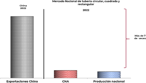 b. en cuanto a la capacidad exportadora de China al mundo, las cifras de las subpartidas arancelarias 7306.19, 7306.30 y 7306.61 muestran que en 2022 se ubicó en más de 7 veces por arriba del CNA y de 9 veces la producción nacional.