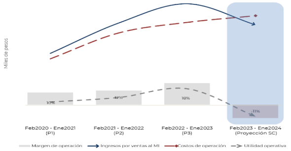 322. Adicionalmente, como resultado del comportamiento en los ingresos proyectados por ventas y de los costos operativos para el periodo febrero de 2023-enero de 2024 (disminución en ingresos de 22% y aumento de costos totales en 5%), los resultados operativos en el mercado nacional disminuirían 1.47 veces respecto al periodo investigado, al grado que reflejarían una pérdida operativa, disminuyendo el margen de operación 29 puntos porcentuales, al pasar de 18% en el periodo investigado a 11% negativo en el periodo de proyección.