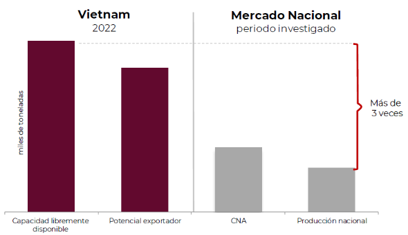 b. el potencial exportador de Vietnam (capacidad instalada menos consumo) creció 168% de 2020 a 2022, al pasar de 49 a 130 mil toneladas; este último volumen fue equivalente a más de 2 veces el tamaño del CNA y más de 3 veces el tamaño de la producción del periodo investigado.