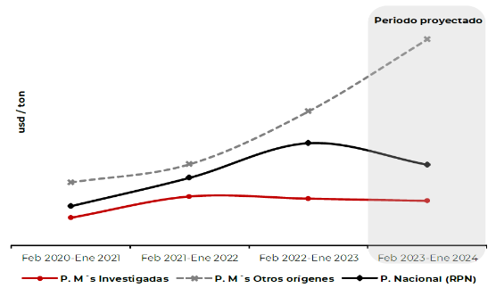 b. aunado a su pérdida de participación en el CNA, el precio promedio de las importaciones de otros orígenes se ubicó por arriba del precio promedio de venta al mercado interno de la rama de producción nacional en el periodo analizado, 23% en el periodo febrero de 2020-enero de 2021, 10% en el periodo febrero de 2021-enero de 2022 y 19% en el periodo investigado.