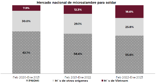 331. Respecto al perfil exportador de Vietnam, la información de UN Comtrade no muestra datos para 2022, por lo cual Electrodos Infra y Plásticos y Alambres realizaron una estimación a partir del crecimiento que estas tuvieron en los dos años previos. De acuerdo con la información disponible, en el periodo analizado el volumen de exportaciones aumentó 262%, al pasar de 31 mil toneladas en 2020 a 114 mil toneladas en 2022. Este último volumen fue equivalente a más de dos veces, tanto del tamaño del CNA como de la producción nacional del periodo investigado. Destaca que las exportaciones a México se incrementaron 191% de 2020 a 2022, lo que indica que la importancia del mercado mexicano aumentó como destino de las ventas de Vietnam a mercados externos.