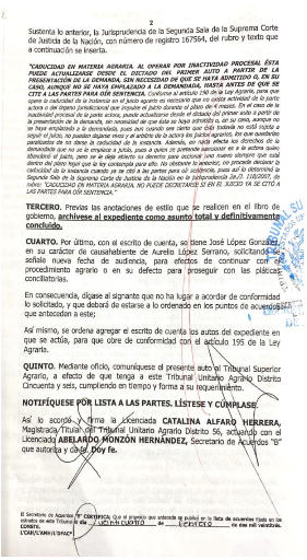 69. Por cuanto al juicio agrario 869/2007, que posteriormente se radicó con el número 768/2014 ante el competente Tribunal Unitario Agrario del Distrito 56; fue iniciado por los causahabientes de Aurelio López Rodríguez, Pedro López González, Aurelio López Serrano, Antonio Pelayo Jiménez y José López Serrano, así como Bruno Ramírez, Leticia Ochoa de Flores, Fidel Contreras, Antonio López Rodríguez, como se desprende de las constancias del mismo que obran en el expediente en que se actúa,(9) las cuales se valoran de conformidad a los artículos 189 de la Ley Agraria, 129 y 202 del Código Federal de Procedimientos Civiles, de aplicación supletoria a la materia agraria, y de donde se desprende que el Tribunal Unitario Agrario del Distrito 56, en auto de veintitrés de febrero de dos mil veintitrés, ordenó el archivo de dicho juicio al haberse decretado la caducidad por inactividad procesal en términos del artículo 190 de la Ley Agraria; como puede apreciarse de la siguiente imagen: