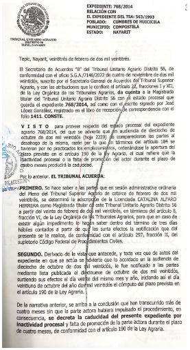 40. Por acuerdo de veintiséis de marzo de dos mil veintitrés, se tuvo por recibido oficio número UAJ/184/2023, de veintitrés de febrero de ese año, por el que la Magistrada del Tribunal Unitario Agrario Distrito 56, con sede en Tepic, Nayarit, informó a este Tribunal Superior que, en la misma fecha, dictó acuerdo dentro de los autos del juicio agrario 768/2014, donde decretó la caducidad de dicho expediente por inactividad procesal.