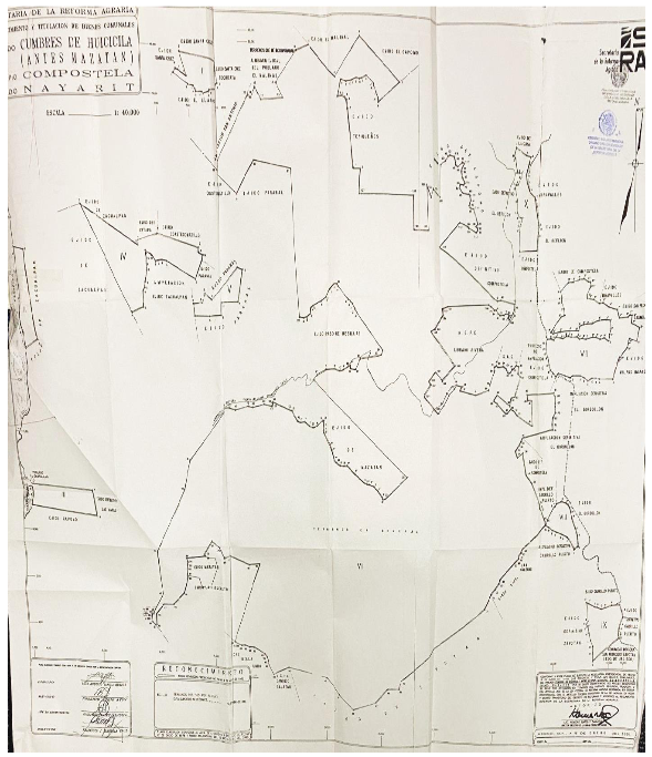 72. Por lo que tal circunstancia obliga forzosamente a considerar en el procedimiento de dotación que se resuelve, que no pueden afectarse tales terrenos, pues los mismos siguen comprendidos en las tierras que fueron reconocidas y tituladas a la comunidad indígena de "Cumbres de Huicicila", como lo justificó esa comunidad con la copia certificada por el Registro Agrario Nacional de la Resolución Presidencial de fecha nueve de junio de mil novecientos setenta, por la cual se le reconoció y se tituló a esa comunidad una superficie de 45,575-00-00 hectáreas el acta de deslinde de diecisiete de enero de mil novecientos setenta y seis; así como el plano de definitivo correspondiente, que se tiene a la vista y corresponde a la siguiente imagen: