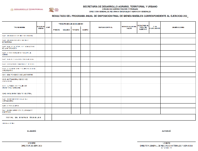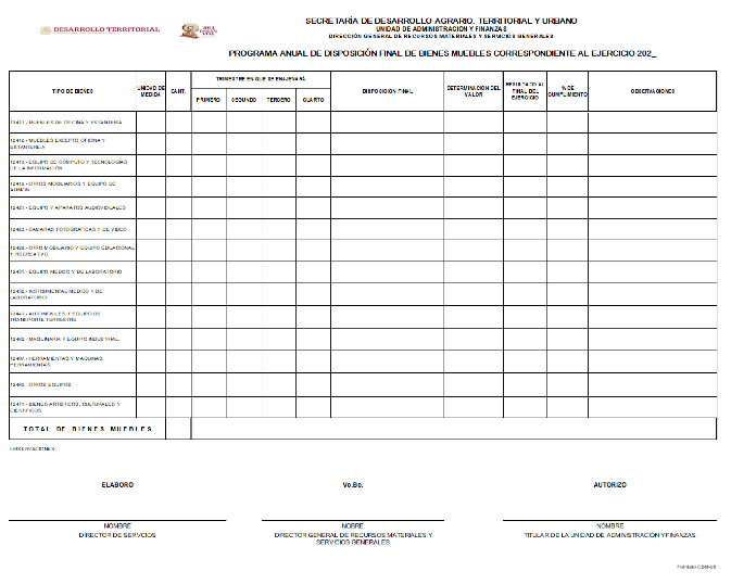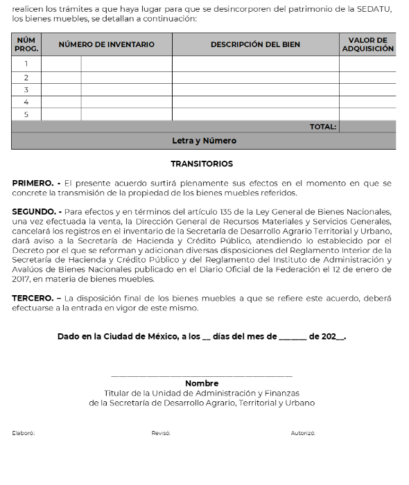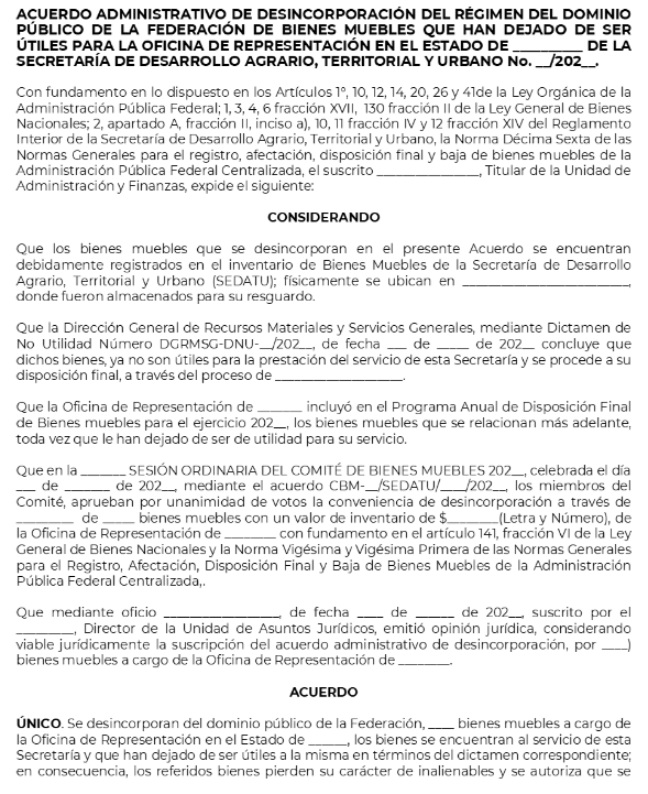 Acuerdo Administrativo de Desincorporación del Régimen de Dominio Público de la Federación de Bienes Muebles que han dejado de ser útiles a la SEDATU. Formato CMB-02.