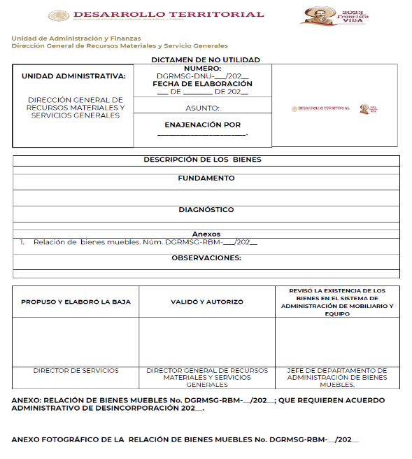 Para el caso de enajenación y transferencia, dictamen de no utilidad en el que se precisen de una manera clara y suficiente las razones justificadas de la no utilidad del bien para el servicio de la SEDATU, el cual deberá elaborarse y firmarse por un servidor público con rango no inferior Subdirector adscrito al área técnica o el área encargada de los inventarios o almacenes; así como autorizarse por el responsable de los recursos materiales o el servidor público en el que se delegue tal función en las Oficinas de Representación y, en su caso, por el titular del área técnica respectiva;