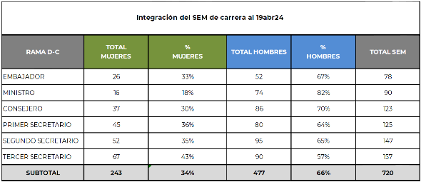 Que al 19 de abril de 2024, el número de integrantes en la Rama Diplomático-Consular por rango se compone de la siguiente manera: