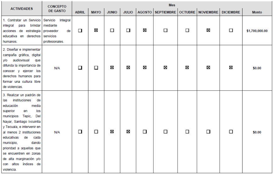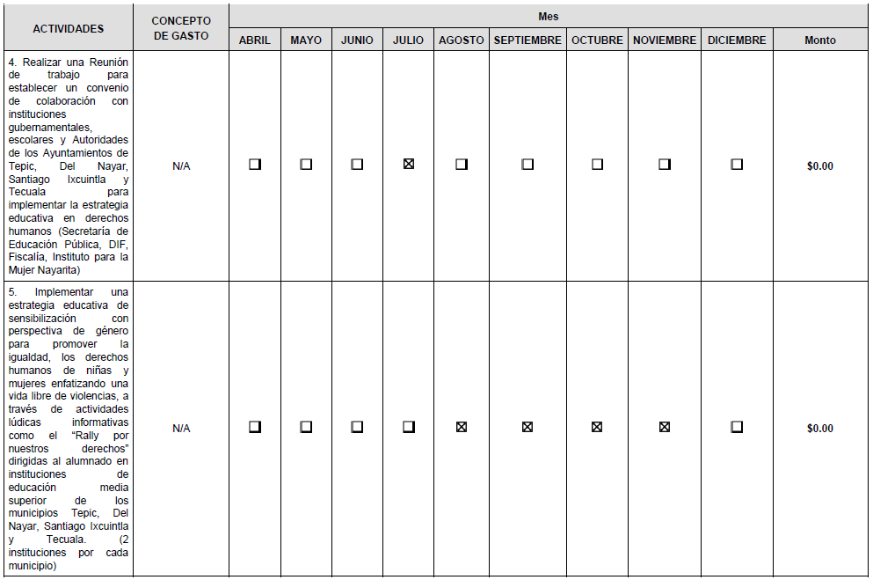 | 4 | Realizar una Reunión de trabajo para establecer un convenio de colaboración con instituciones gubernamentales, escolares y Autoridades de los Ayuntamientos de Tepic, Del Nayar, Santiago Ixcuintla y Tecuala para implementar la estrategia educativa en derechos humanos (Secretaría de Educación Pública, DIF, Fiscalía, Instituto para la Mujer Nayarita) |