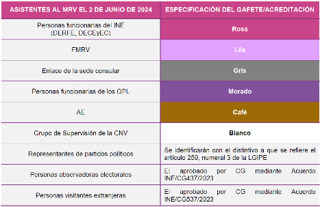 o Personal del INE, OPL en su caso, y enlaces de las sedes consulares, deberán contar con los distintivos/gafetes que para efectos de identificación y permanencia en los MRV les proporcione el INE.