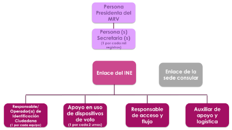 | IV. Situación con el electorado o personas ajenas al proceso de votación que afecte la operación | o Identificada la situación, la persona presidenta del MRV, en conjunto con los enlaces del INE y de la sede consular, determinará una solución, garantizando en todo momento la libertad, seguridad y secrecía del voto, de acuerdo con lo definido en el artículo 280 de la LGIPE. o Las soluciones acordadas se harán de conocimiento del Grupo de Seguimiento. o A continuación, se visualizan las siguientes situaciones con el electorado: i. Se presentan personas en fila para votar o dentro del MRV, que portan propaganda a favor o en contra de algún candidatura o partido político: a) La persona presidenta les solicitará que cubran, o de ser posible, se retiren la pieza de ropa o accesorio que tenga la propaganda. b) Si se niegan, se solicitará que se retiren del MRV. ii. En el MRV o a su alrededor (50 metros) se advierte la presencia de personas o grupos que realizan actos de proselitismo, llevan propaganda a favor o en contra de algún partido político o candidatura independiente (ya sea vestimenta, accesorios o vehículos) o reparten artículos promocionales: a) Siempre que no ponga en riesgo su integridad física, la persona Presidenta les invitará a que dejen de realizar proselitismo. b) Si se niegan, la persona Presidenta de MRV podrá declarar la suspensión de la votación hasta que se dejen de realizar actos de proselitismo o las personas se retiren del lugar. iii. Si hay obstaculización o interferencia en el desarrollo de la votación por parte de FMRV, representantes de partidos políticos, u otras personas ajenas al MRV, la persona Presidenta podrá llamar al orden y, en su caso, a retirarse del MRV. iv. Si durante la votación, la persona Presidenta del MRV considera que se presenta una situación que rompe el orden público o pone en riesgo la integridad física de las personas dentro del MRV, se llevará a cabo lo siguiente: a) La persona Presidenta del MRV junto con los enlaces del INE y del consulado, acordarán una solución, llevando a cabo las medidas que resulten necesarias. b) En caso de violencia en el MRV; se podrá suspender temporalmente la votación y se reanudará tan pronto existan condiciones. En este caso se evaluará entre la persona presidenta del MRV y los enlaces del INE y de la sede consular, la posibilidad de solicitar apoyo de seguridad de la sede o de la ciudad. |