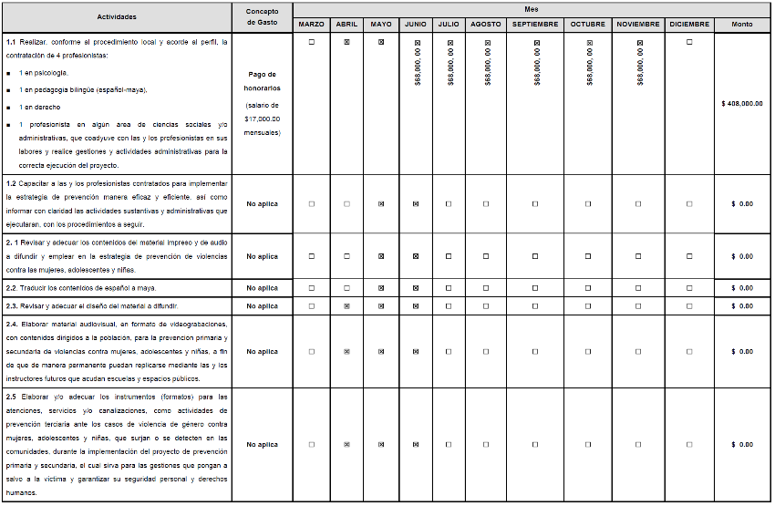 | 2. Revisión y adecuación de contenidos y diseño del material impreso y de audio a difundir, temáticos y bilingües (maya-español) para la prevención de las violencias, que informen, sensibilicen y fomenten la cultura de identificación, denuncia de delitos con énfasis en feminicidio, delitos sexuales, violencia familiar, trata de personas, y abstención de violencias contra las mujeres, adolescentes y niñas, así como de otras violaciones a sus derechos humanos, en centros escolares y con familias establecidas en comunidades rurales con población indígena. Asimismo, elaboración y/o adecuación de los instrumentos (formatos) a emplear en el proyecto para las atenciones, servicios y/o canalizaciones, como actividades de prevención terciaria ante los casos de violencia de género contra mujeres, adolescentes y niñas, que surjan o se detecten durante las intervenciones. | 2. 1 Revisar y adecuar los contenidos del material impreso y de audio a difundir y emplear en la estrategia de prevención de violencias contra las mujeres, adolescentes y niñas. 2.2. Traducir los contenidos de español a maya. 2.3. Revisar y adecuar el diseño del material a difundir. 2.4. Elaborar material audiovisual, en formato de videograbaciones, con contenidos dirigidos a la población, para la prevención primaria y secundaria de violencias contra mujeres, adolescentes y niñas, a fin de que de manera permanente puedan replicarse mediante las y los instructores futuros que acudan escuelas y espacios públicos. 2.5 Elaborar y/o adecuar los instrumentos (formatos) para las atenciones, servicios y/o canalizaciones, como actividades de prevención terciaria ante los casos de violencia de género contra mujeres, adolescentes y niñas, que surjan o se detecten en las comunidades, durante la implementación del proyecto de prevención primaria y secundaria, el cual sirva para las gestiones que pongan a salvo a la víctima y garantizar su seguridad personal y derechos humanos. | 2.1 Los productos finales validados, con contenidos impresos y de audio que se difundirán. 2.2 El total de los contenidos traducidos de español a maya. 2.3 El total diseños validados a difundir. 2.4 Las videograbaciones, producidas con contenidos dirigidos a la población, para la prevención primaria y secundaria de violencias contra mujeres, adolescentes y niñas. 2.5 Los formatos validados que se empleen para en las atenciones, servicios y/o canalizaciones, como actividades de prevención terciaria ante los casos de violencia de género contra mujeres, adolescentes y niñas, que surjan o se detecten en las comunidades, durante la implementación del proyecto de prevención primaria y secundaria. | 2.1 Expediente con documentación de gestiones y productos finales para imprimir y de audio a difundir, y emplear en la estrategia de prevención primaria y secundaria de violencias contra las mujeres, adolescentes y niñas, así como de los instrumentos a utilizar en las atenciones, servicios y/o canalizaciones, como actividades de prevención terciaria ante casos de violencia. 2.2 Las videograbaciones, producidas con contenidos dirigidos a la población, para la prevención primaria y secundaria de violencias contra mujeres, adolescentes y niñas. 2.3. Formatos elaborados y validados para la gestión y registro de atenciones, servicios y/o canalizaciones, ante casos de violencia que surjan o se detecten. |