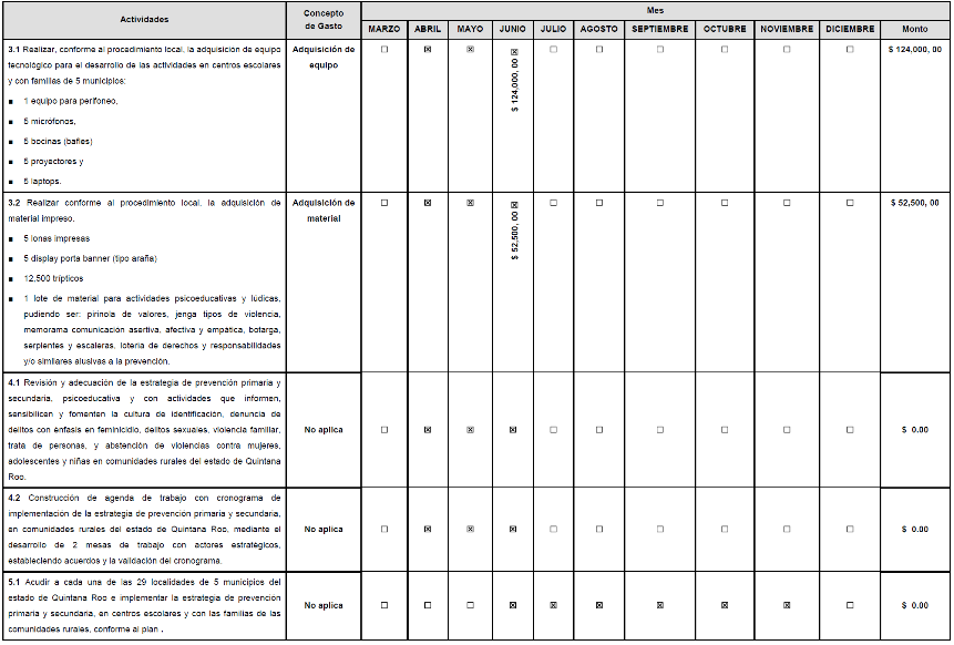 | 4. Delimitar y establecer un plan y cronograma para la implementación de la estrategia de prevención primaria y secundaria, psicoeducativa y actividades que informen, sensibilicen y fomenten la cultura de identificación, denuncia de delitos con énfasis en feminicidio, delitos sexuales, violencia familiar, trata de personas, y abstención de violencias contra mujeres, adolescentes y niñas, en centros escolares y con familias establecidas en 29 localidades de 5 municipios del estado de Quintana Roo, siendo comunidades rurales con población indígena, considerando y actuando sobre las causas y los factores que las generan, con enfoque interseccional, diferencial, de derechos humanos y perspectiva de género, para incidir en la transformación de patrones culturales que producen y reproducen violencias, y prevenir la ocurrencia de hechos de violencia y delitos por razones de género. | 4.1 Revisión y adecuación de la estrategia de prevención primaria y secundaria, psicoeducativa y con actividades que informen, sensibilicen y fomenten la cultura de identificación, denuncia de delitos con énfasis en feminicidio, delitos sexuales, violencia familiar, trata de personas, y abstención de violencias contra mujeres, adolescentes y niñas en comunidades rurales del estado de Quintana Roo. 4.2 Construcción de agenda de trabajo con cronograma de implementación de la estrategia de prevención primaria y secundaria, en comunidades rurales del estado de Quintana Roo, mediante el desarrollo de 2 mesas de trabajo con actores estratégicos, estableciendo acuerdos y la validación del cronograma. | 4.1 El plan de trabajo con cronograma validados para la implementación de la estrategia de prevención primaria y secundaria, psicoeducativa y actividades a desarrollar, en centros escolares y con familias establecidas en 29 localidades de 5 municipios del estado de Quintana Roo, siendo comunidades rurales con población indígena. | 4.1 El plan de trabajo con cronograma validados para la implementación de la estrategia de prevención primaria y secundaria, psicoeducativa y actividades a desarrollar, en centros escolares y con familias establecidas en 29 localidades de 5 municipios del estado de Quintana Roo, siendo comunidades rurales con población indígena. 4.2 Expediente de gestiones y mesas de trabajo realizadas con minutas, para establecer el plan de trabajo con cronograma validados, para la implementación de la estrategia de prevención en centros escolares y con familias establecidas en 29 localidades de 5 municipios del estado de Quintana Roo, siendo comunidades rurales con población indígena. |