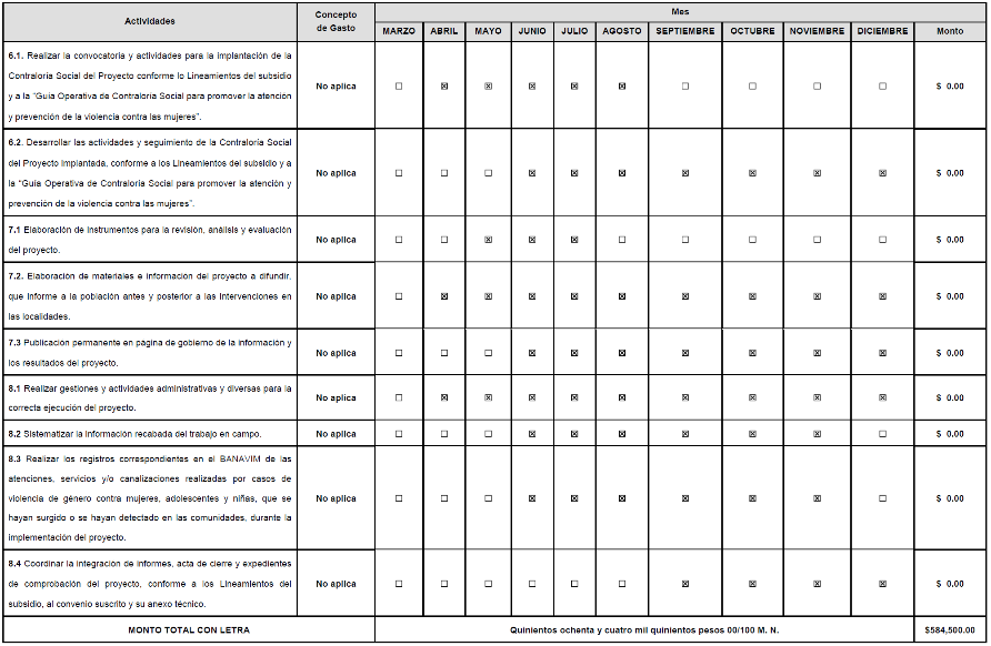 | 6 | Se implementará la Contraloría Social del Proyecto, por la cual se realizará la convocatoria y actividades para la implantación de la Contraloría Social del Proyecto conforme lo Lineamientos del subsidio y a la "Guía Operativa de Contraloría Social para promover la atención y prevención de la violencia contra las mujeres". Una vez conformada, se desarrollarán las actividades y seguimiento de la Contraloría Social del Proyecto implantada, conforme a los Lineamientos del subsidio y a la "Guía Operativa de Contraloría Social para promover la atención y prevención de la violencia contra las mujeres". |
