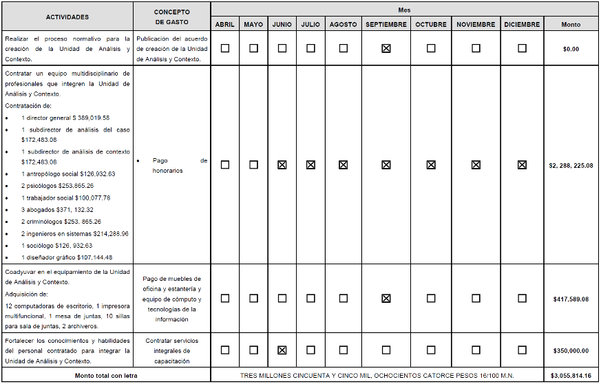 | Contratar un equipo multidisciplinario de profesionales que integren la Unidad de Análisis y Contexto. | Contratación de: · 1 director general · 1 subdirector de análisis del caso · 1 subdirector de análisis de contexto · 1 antropólogo social · 2 psicólogos · 1 trabajador social · 3 abogados · 2 criminólogos · 2 ingenieros en sistemas · 1 sociólogo · 1 diseñador gráfico | Número de profesionistas contratados/número de profesionistas programados*100 | Contratos de los profesionistas. |