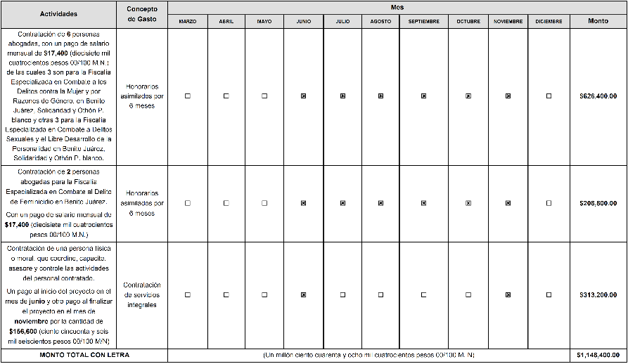 | Contratación de 2 personas abogadas para la Fiscalía Especializada en Combate al Delito de Feminicidio en Benito Juárez. | Porcentaje de carpetas activas a partir de la intervención respecto del total de carpetas inactivas programadas para intervenir al mes (6 meses o más sin actividad). Porcentaje según tipo de actuaciones realizadas (periciales, entrevistas, informes de investigación, otras) respecto del total de carpetas intervenidas (al mes). Número de carpetas de investigación integradas para determinación respecto del total de carpetas intervenidas (al mes). | - Bitácora diaria de actividades. - Ficha de revisión de expedientes. - Informes mensuales de actividades - Informe final - Reportes al BANAVIM. |