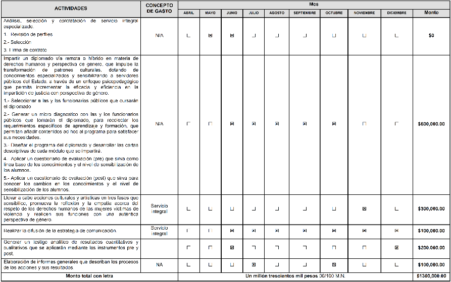 | 2 | Impartir un diplomado vía remota o híbrido en materia de derechos humanos y perspectiva de género que impulse la transformación de patrones culturales, dotando de conocimientos especializados y se sensibilizando a servidores públicos del Estado y de los 11 municipios considerados por el GIM, a través de un enfoque psicopedagógico que permita incrementar la eficacia y eficiencia en la impartición de justicia con perspectiva de género. Acciones para el desarrollo: 1.- Se realizarán cartas descriptivas de cada uno de los módulos del diplomado que contengan los temas que se abordarán, el tiempo que se tiene programado para cada uno de ellos; las estrategias psicopedagógicas que se implementarán, los materiales que se utilizarán para el desarrollo de las sesiones y la bibliografía que se utilizará para el desarrollo de cada módulo. 2.- Se gestionarán los espacios para la realización de las sesiones presenciales en caso de realizarse. La institución responsable (IEM) deberá de gestionar los espacios y los recursos materiales para poder llevarse a cabo (Computadora, equipo de sonido, acceso a internet, etc.) 3.- Para la fase diagnóstica se implementarán cuestionarios, entrevistas y otras técnicas para la obtención de información. 4.- Se diseñará un cuestionario de evaluación que se aplicará al inicio y al final del diplomado. 5.- Se otorgarán los diplomas de manera física a cada uno de los alumnos que hayan concluido el diplomado. 6.- Gestionar los espacios y la invitación a los medios de comunicación que se requieran para la realización de las ruedas de prensa. |