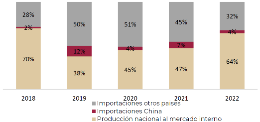 141. Los inventarios de la rama de producción nacional disminuyeron 33% en el periodo analizado: decrecieron 32% en 2019 y 16% en 2020, y aumentaron 2% en 2021 y 14% en 2022.